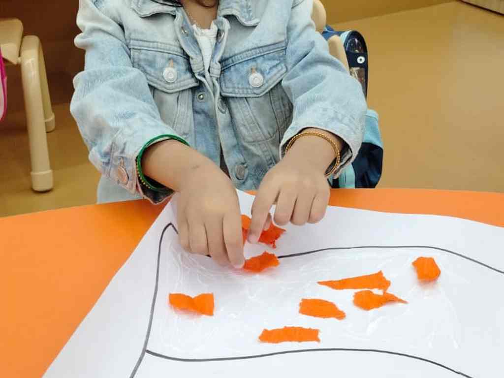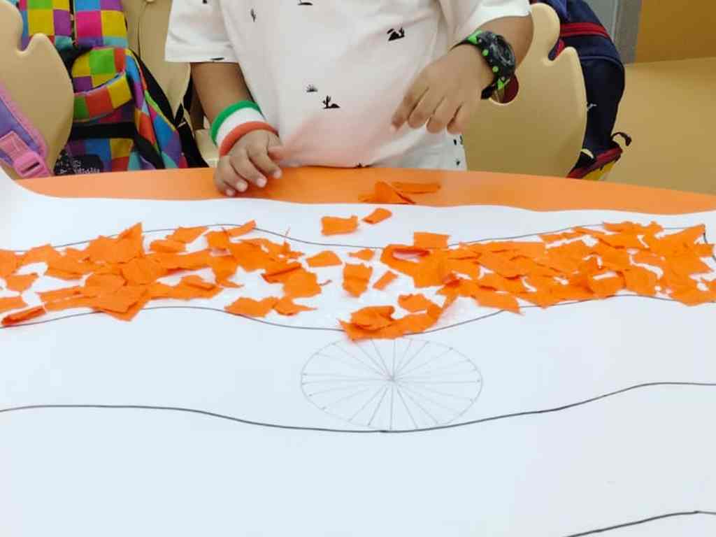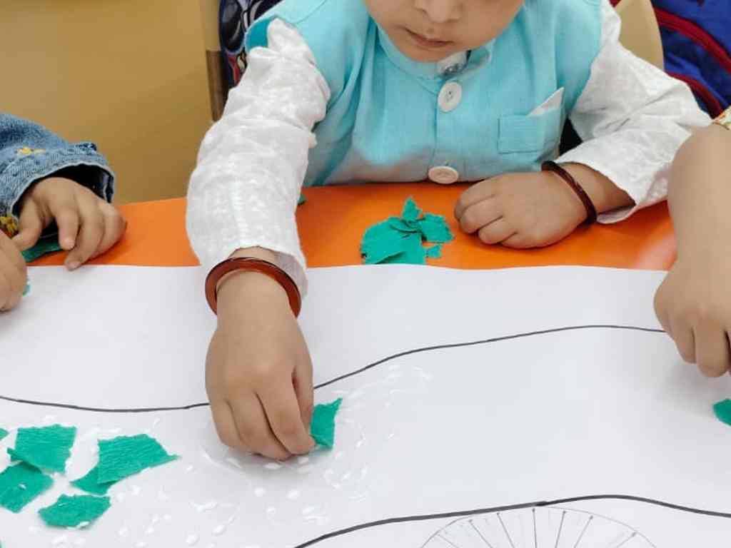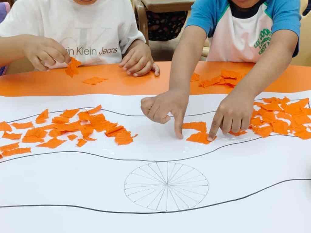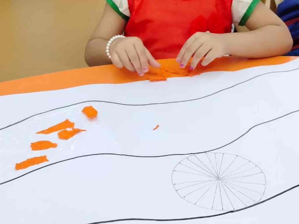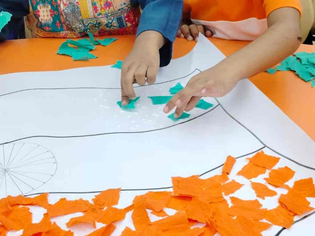 tearing and sticking, and creating beautiful tricolour crafts. These activities helped