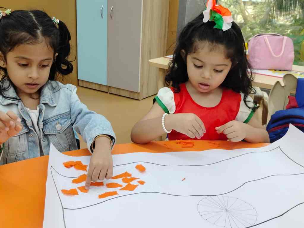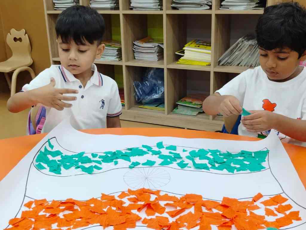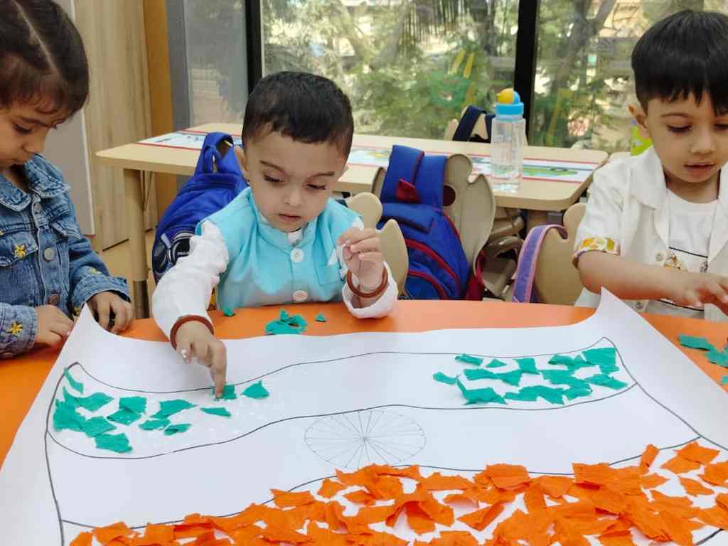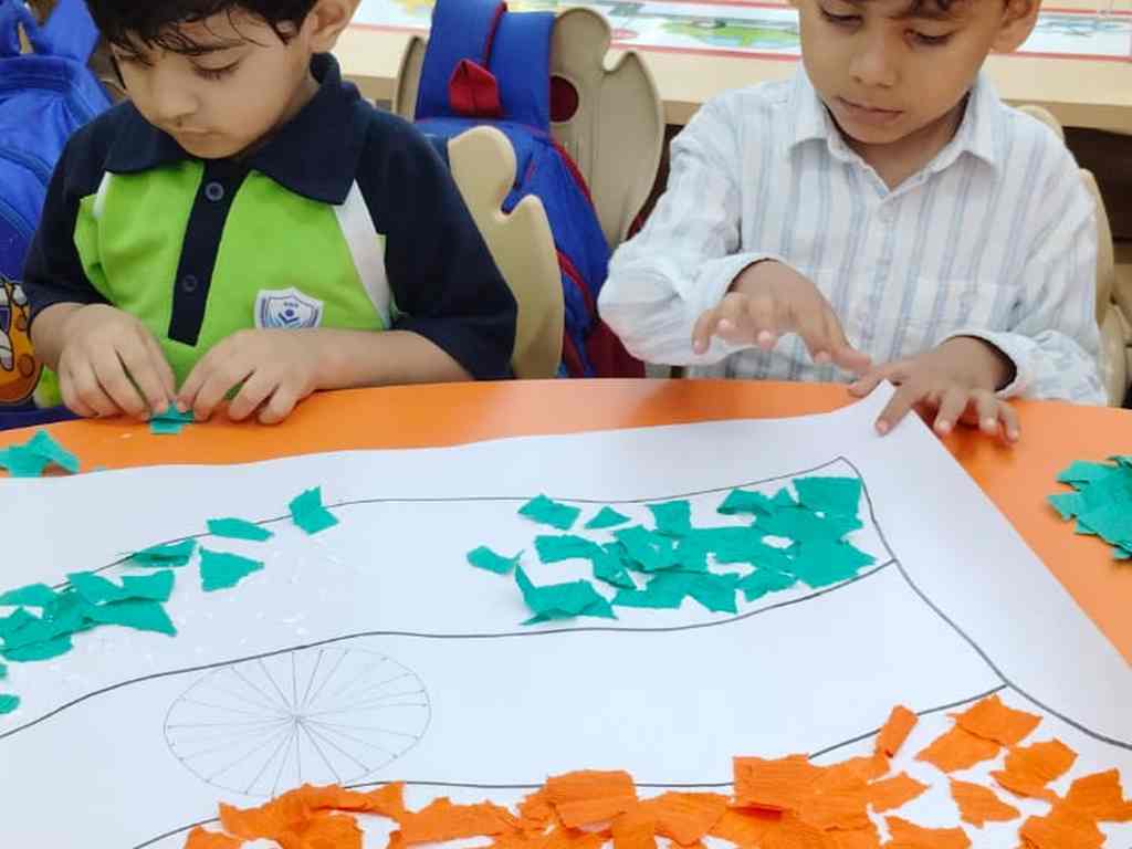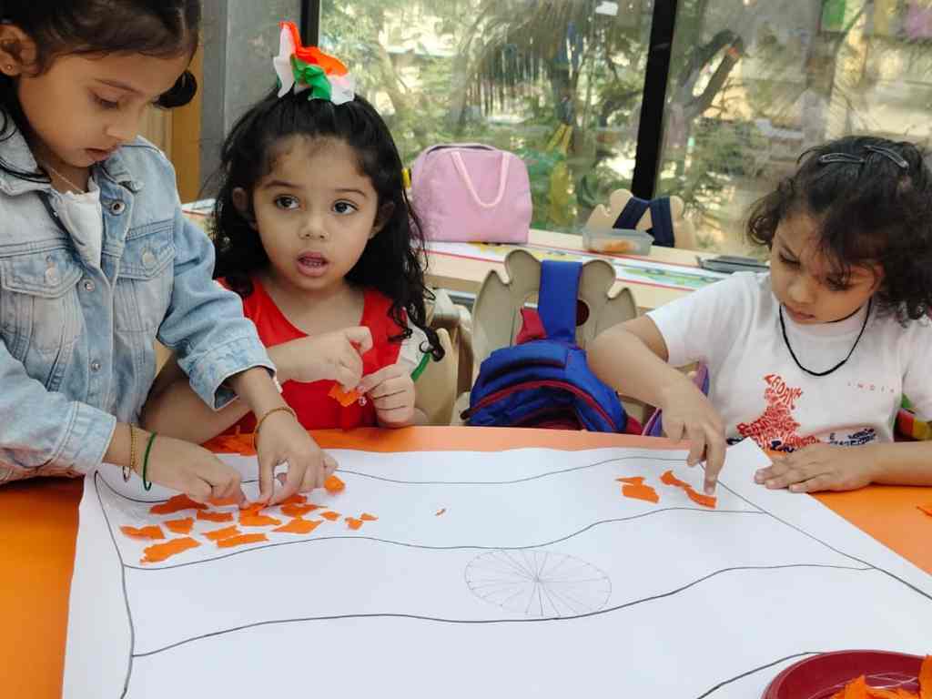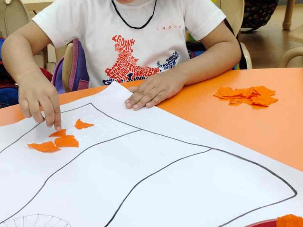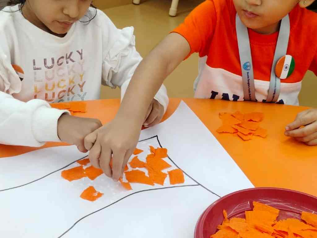 tearing and sticking, and creating beautiful tricolour crafts. These activities helped