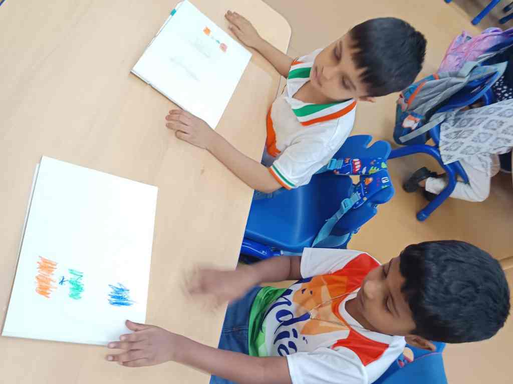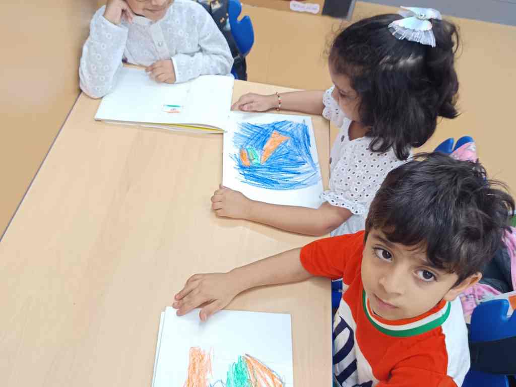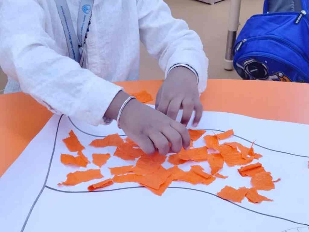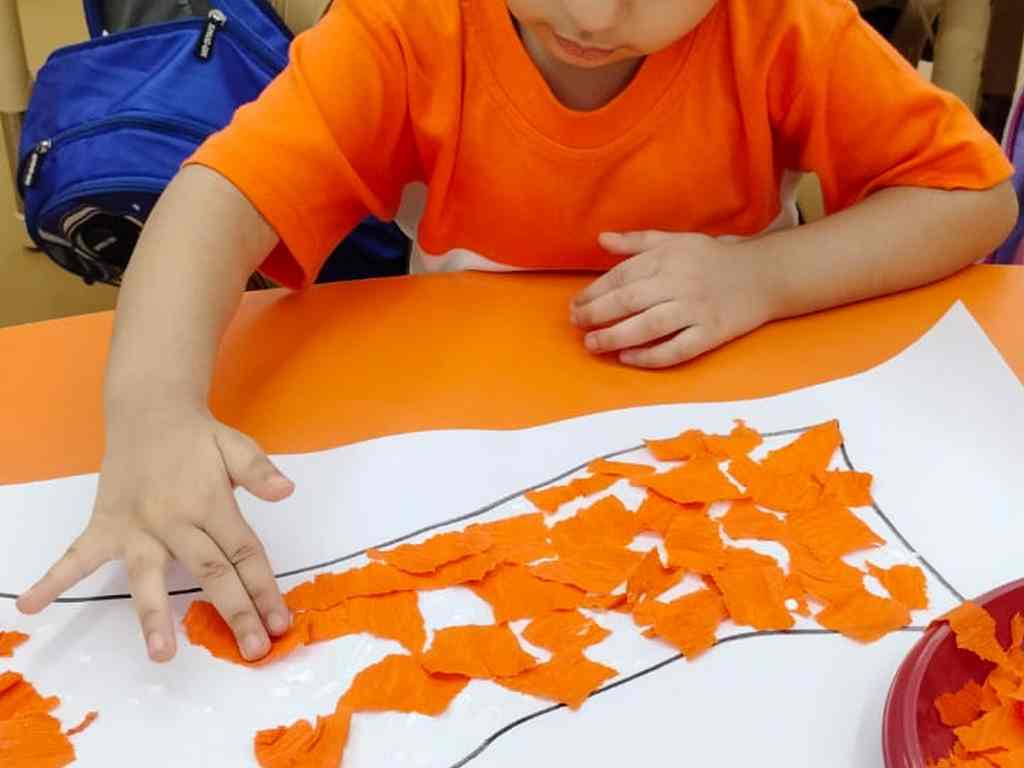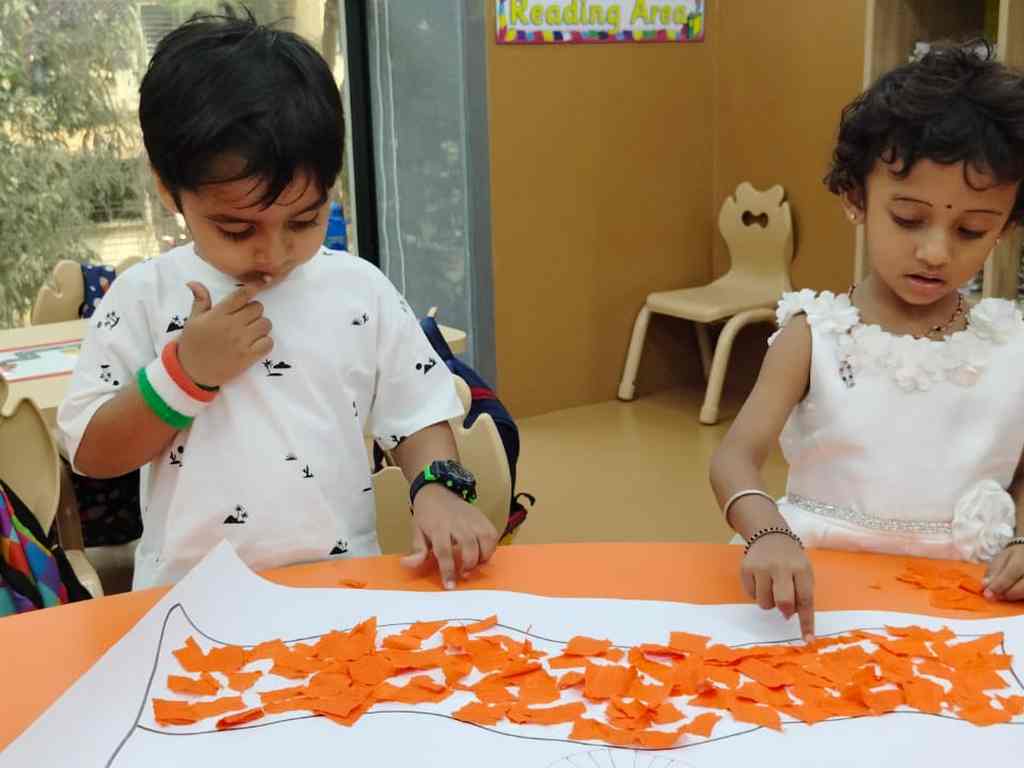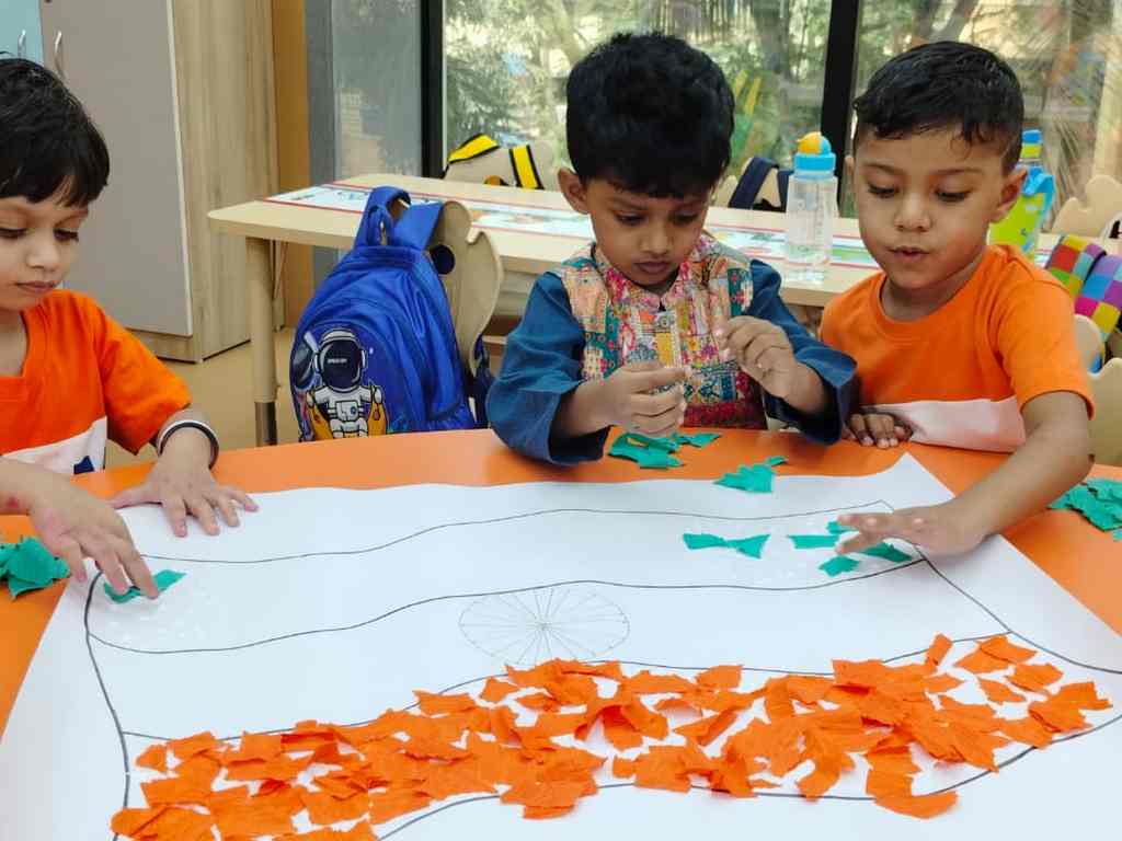 tearing and sticking, and creating beautiful tricolour crafts. These activities helped